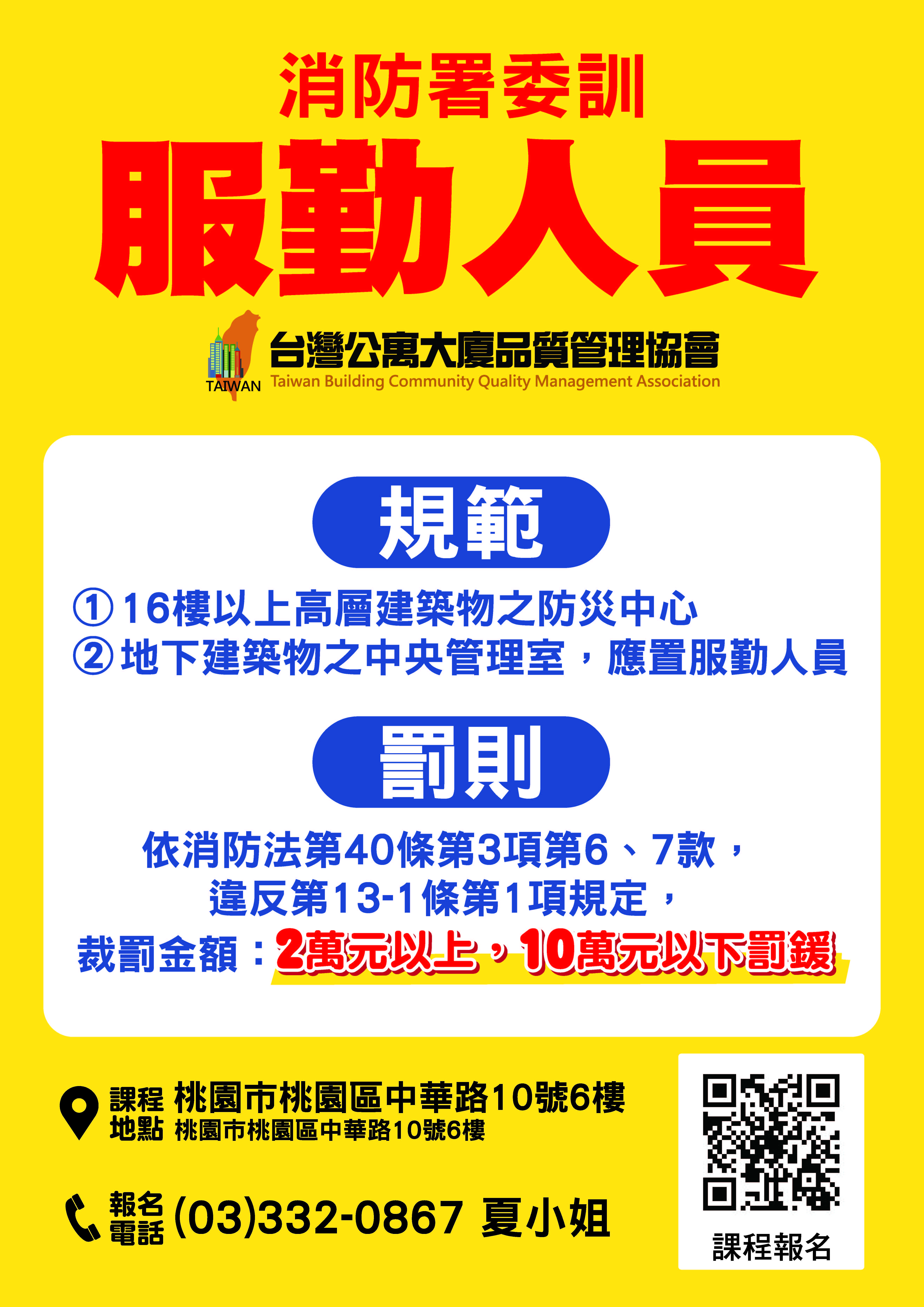 桃園市桃園區中華路10號6樓之5※ 服勤人員初訓上課地點:桃園市桃園區中華路10號6樓之5( 近桃園火車站前站)